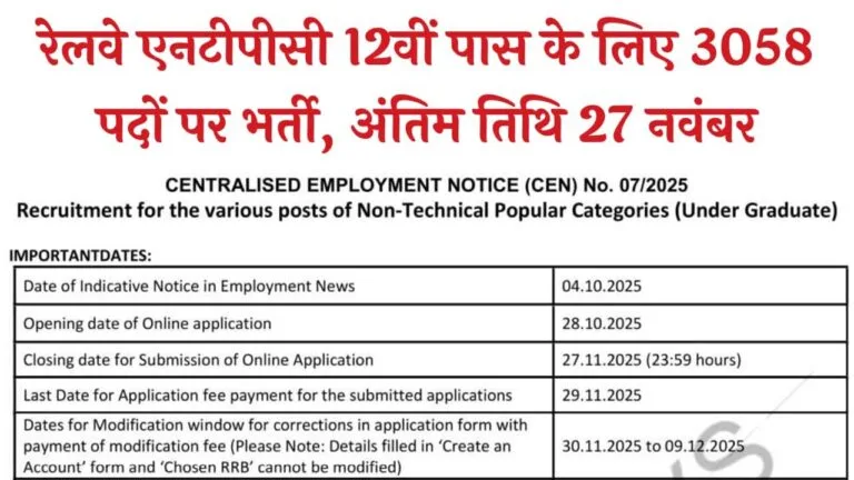 रेलवे भर्ती बोर्ड द्वारा एनटीपीसी 12th लेवल के कुल 3058 पदों पर भर्ती की जाएगी रेलवे एनटीपीसी 12th लेवल भर्ती के लिए ऑनलाइन आवेदन की शुरुवात 28 अक्टूबर से लेकर 27 नवंबर 2025 तक भरे जाएंगे जबकि ऑनलाइन आवेदन फॉर्म शुल्क जमा करने की अंतिम तिथि 29 नवंबर 2025 तक रखी गई है रेलवे एनटीपीसी 12th लेवल आवेदन फार्म में संशोधन का अवसर 30 नवंबर 2025 से लेकर 09 दिसंबर 2025 तक दिया गया है।